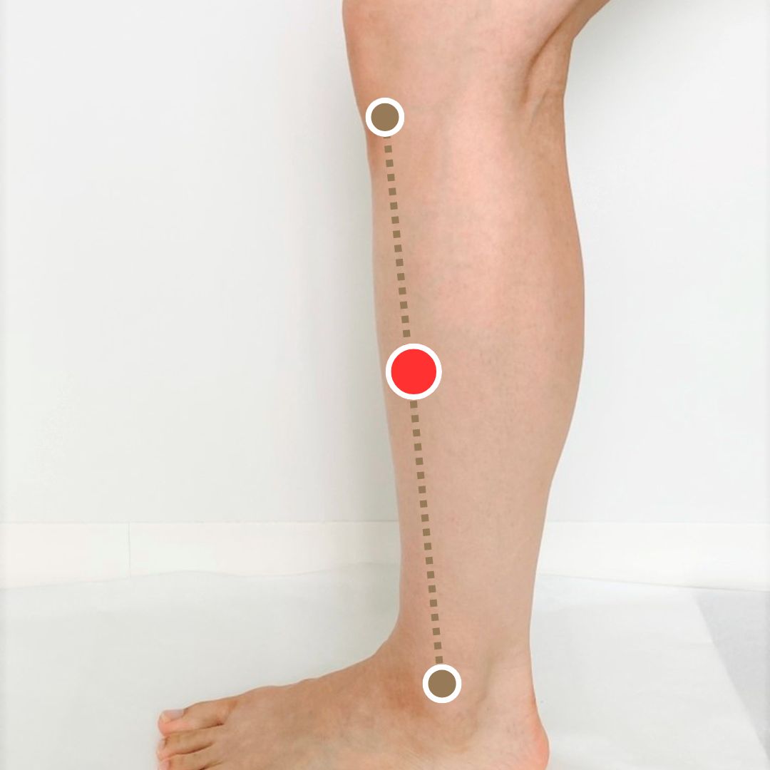 膝のお皿の下の外側の凹みと外くるぶしのを結んだ線の真ん中。