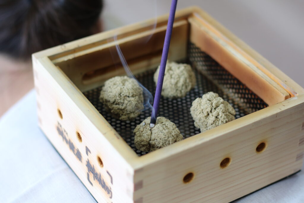 もぐさには、シネオールという精油成分が含まれています。よもぎやユーカリにも含まれるもので、消毒・殺菌・鎮静・鎮痛作用などがあります。お灸をすることによって、この成分が皮膚の表面から内部に浸透していき、痛みを和らげるなどの効果が期待できます。この成分は、もぐさを燃やした際に出る煙にも含まれており、もぐさの匂いにはリラックス効果もあります。